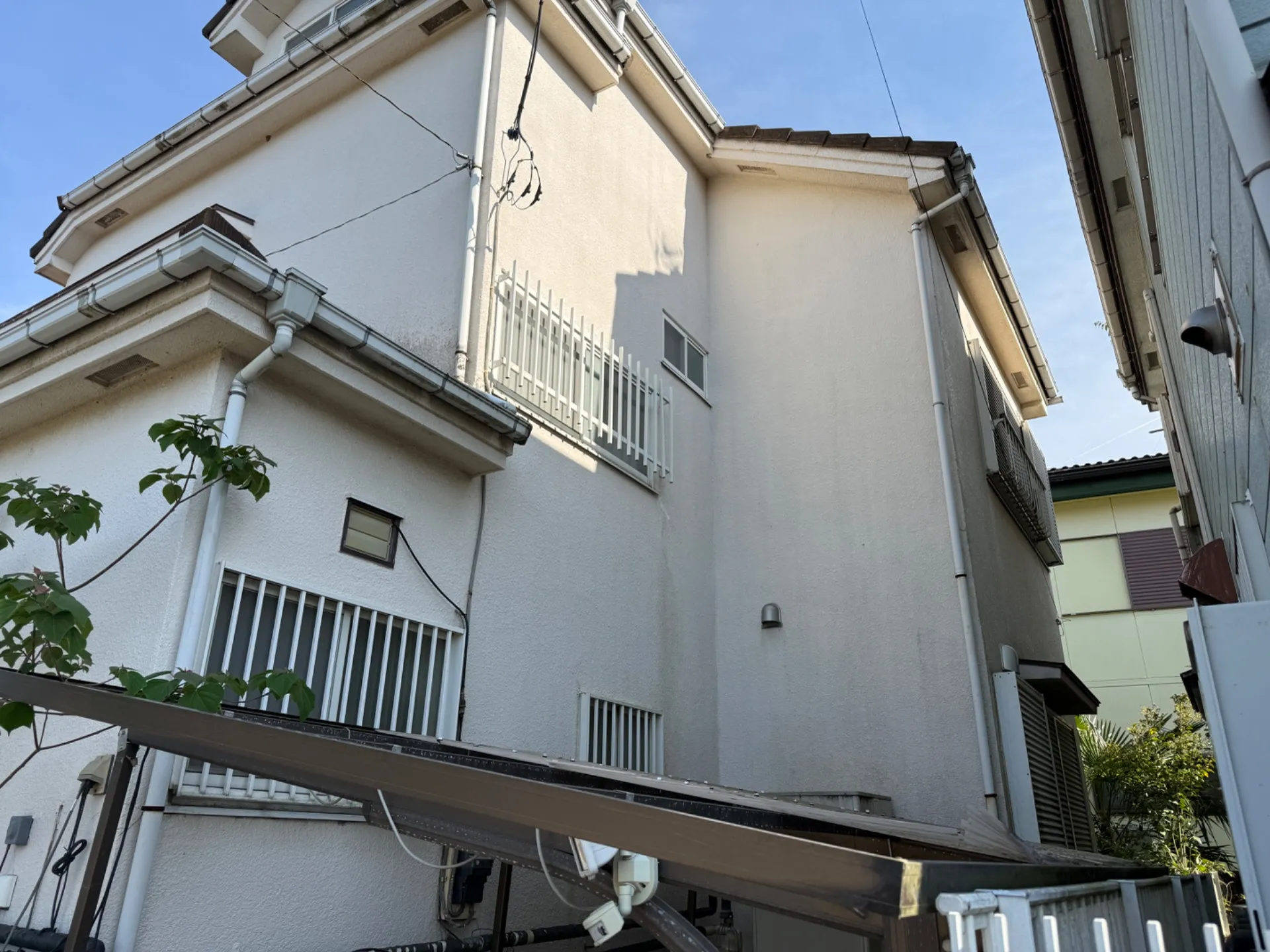 狭山市で外壁塗装、外壁張替の現地調査を行いました。物置が倒れてきたようで火災保険での対応になります。また、コーキングなども劣化していたため、一緒に塗装も検討されるようです。足場も10何万とか…
